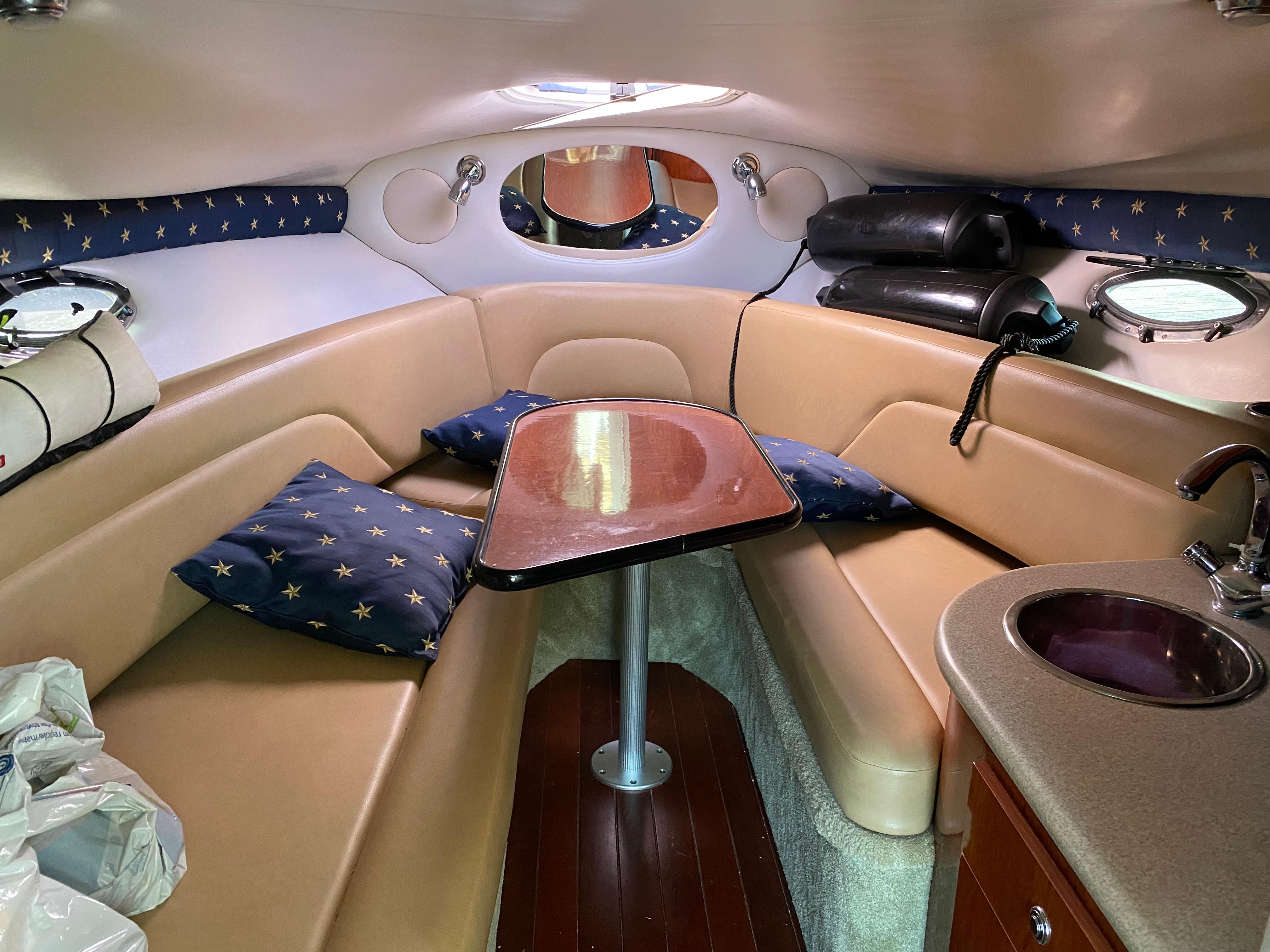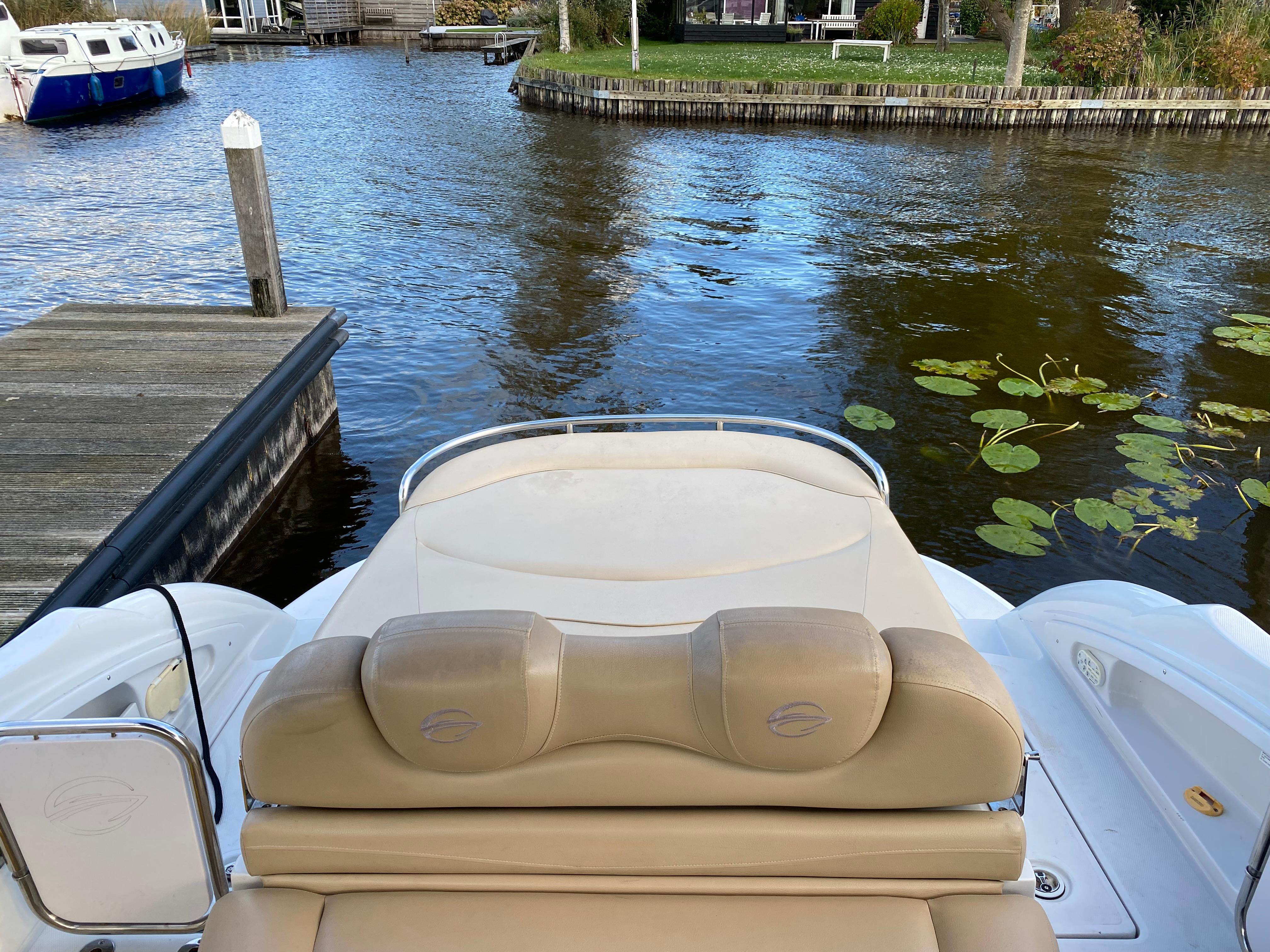 Het schip is rijk uitgerust met luxe banken met lederen bkleding, biminitop, audioinstallatie, navigatiesysteem, zonnedek, zwemplateau met zwemtrap, kuiptafel, koelkast en bekerhouders.