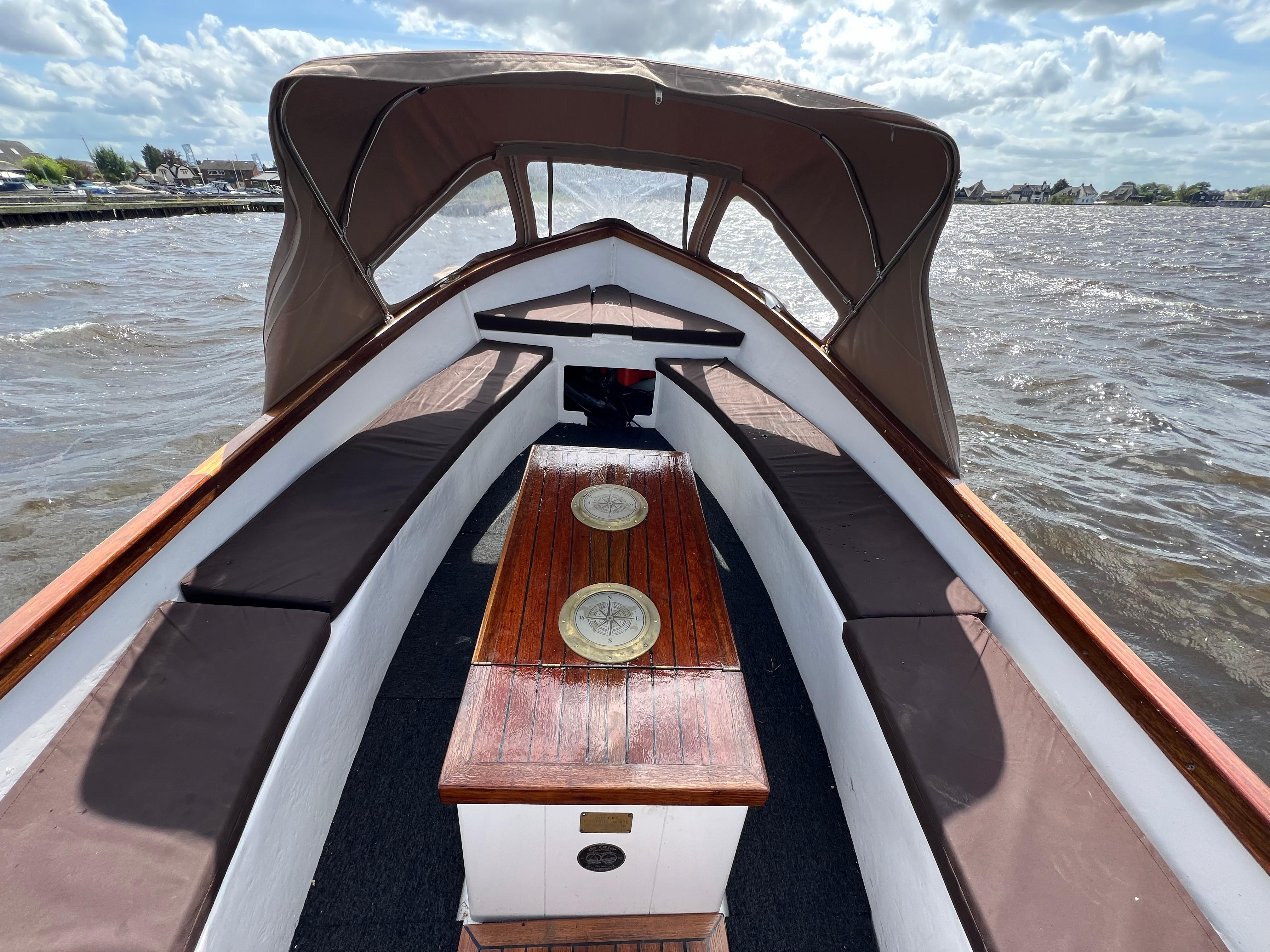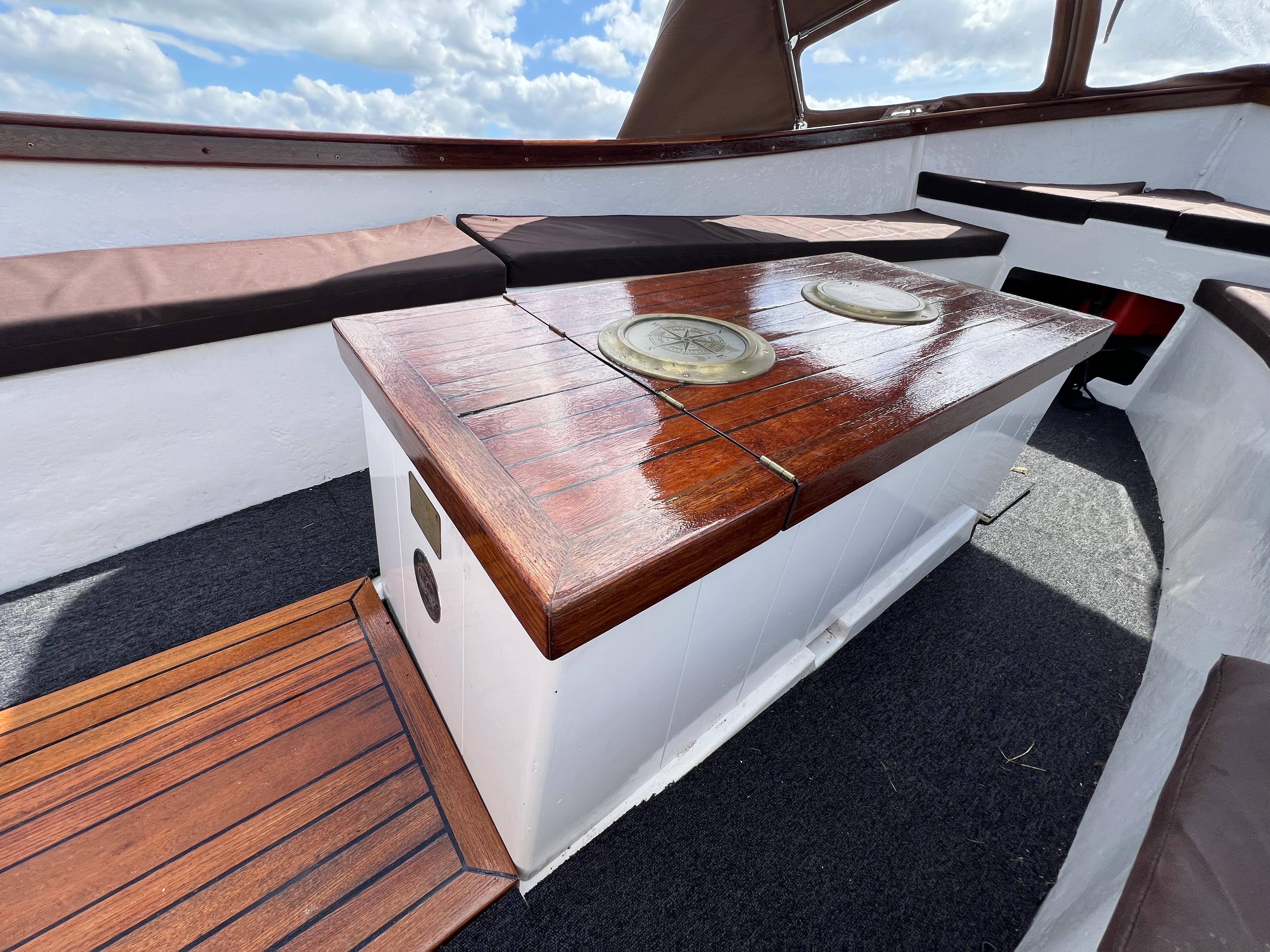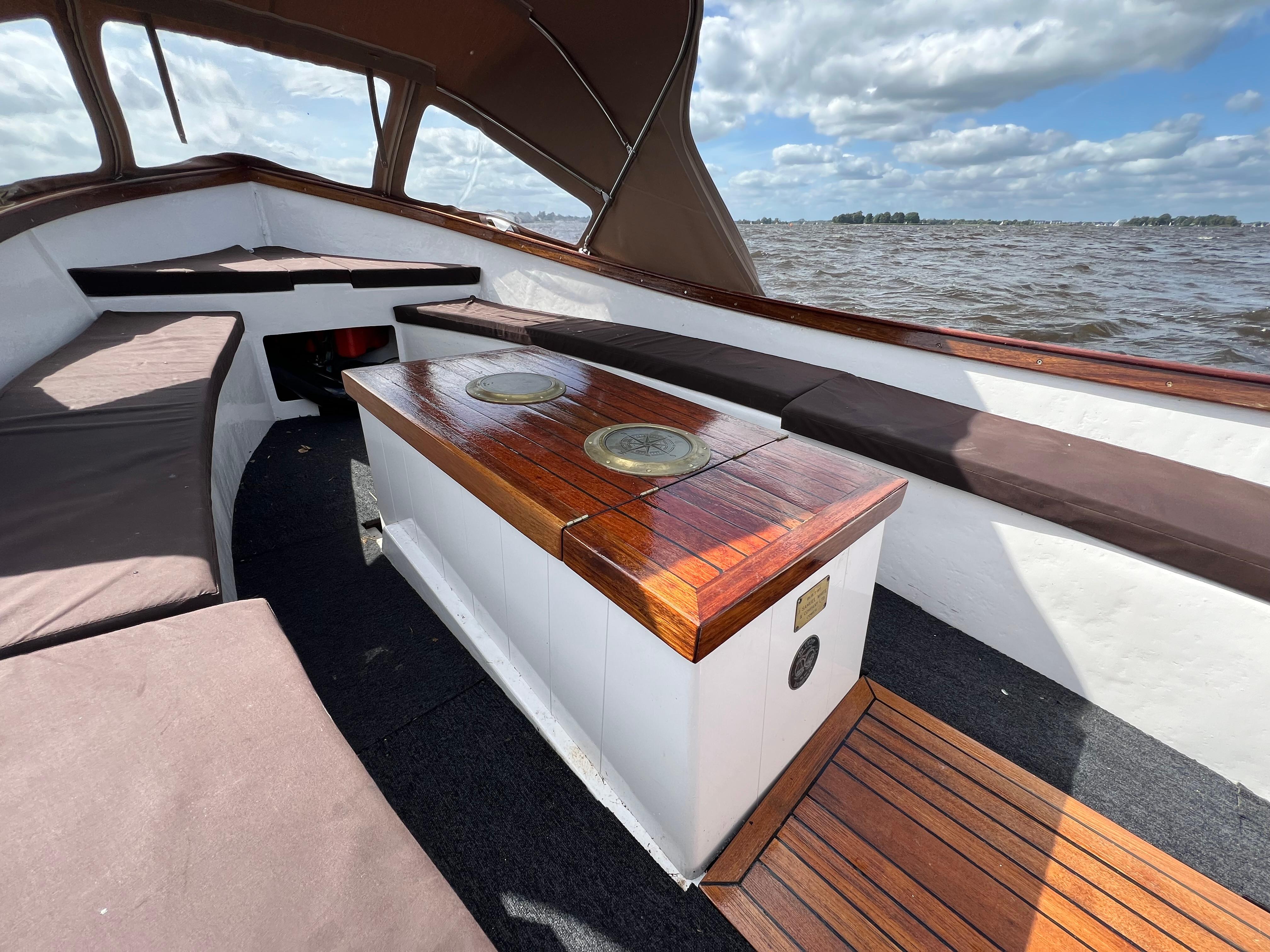 De sloep is voorzien van een complete kussenset, buiskap, helmstok, alle nodige verlichting en een prachtig afgewerkte geïsoleerde motorkist.