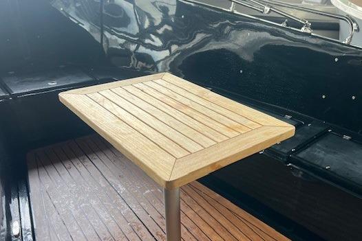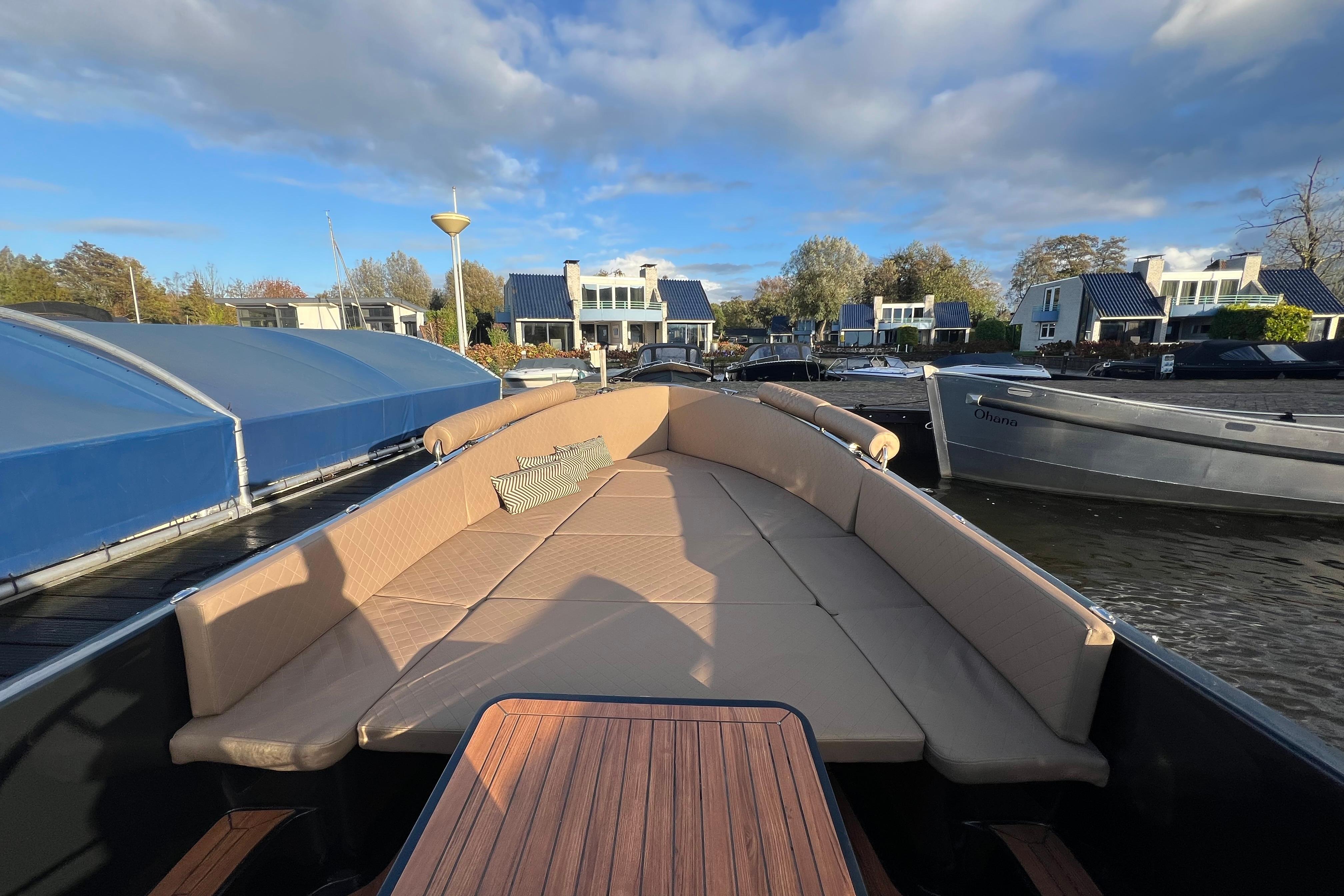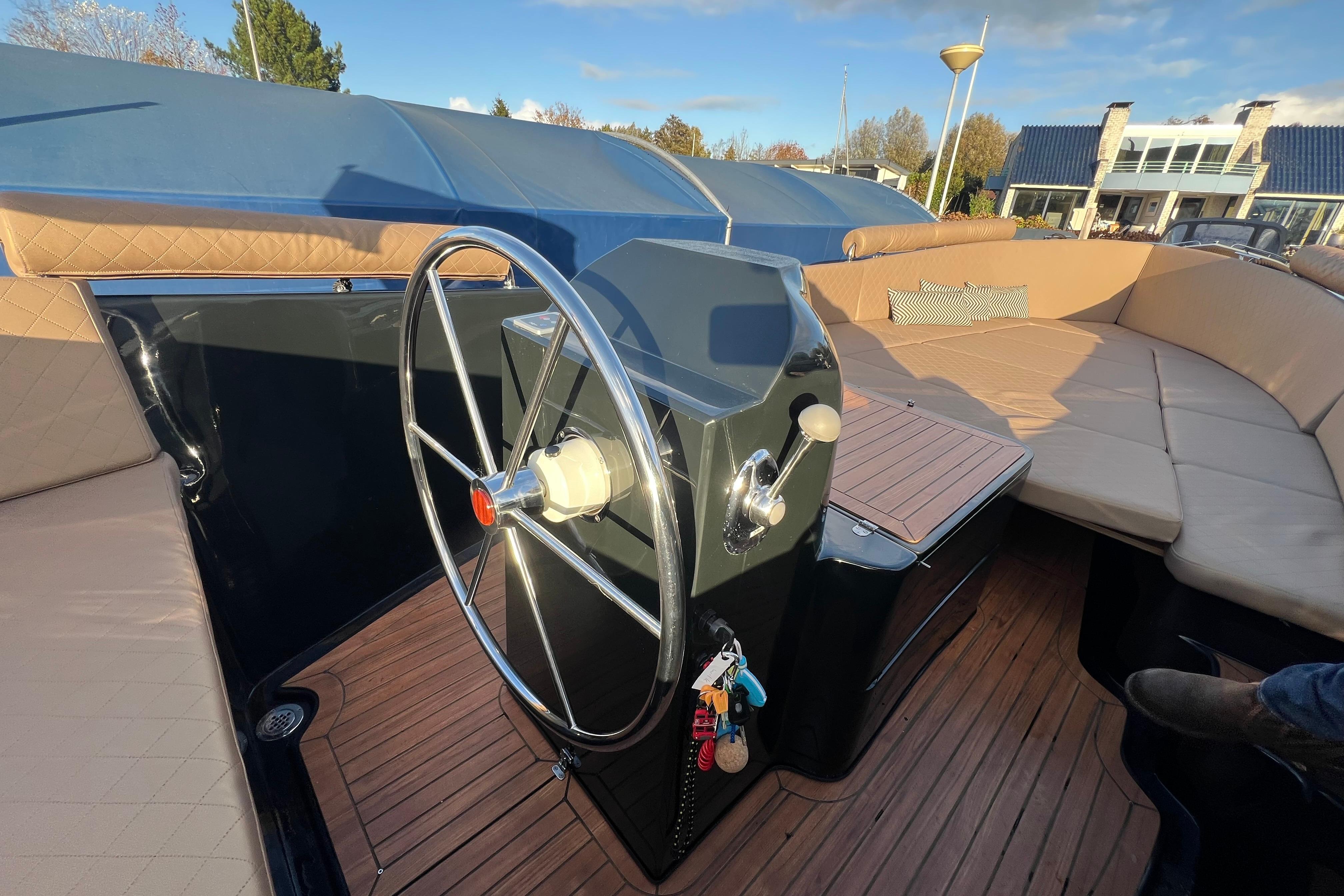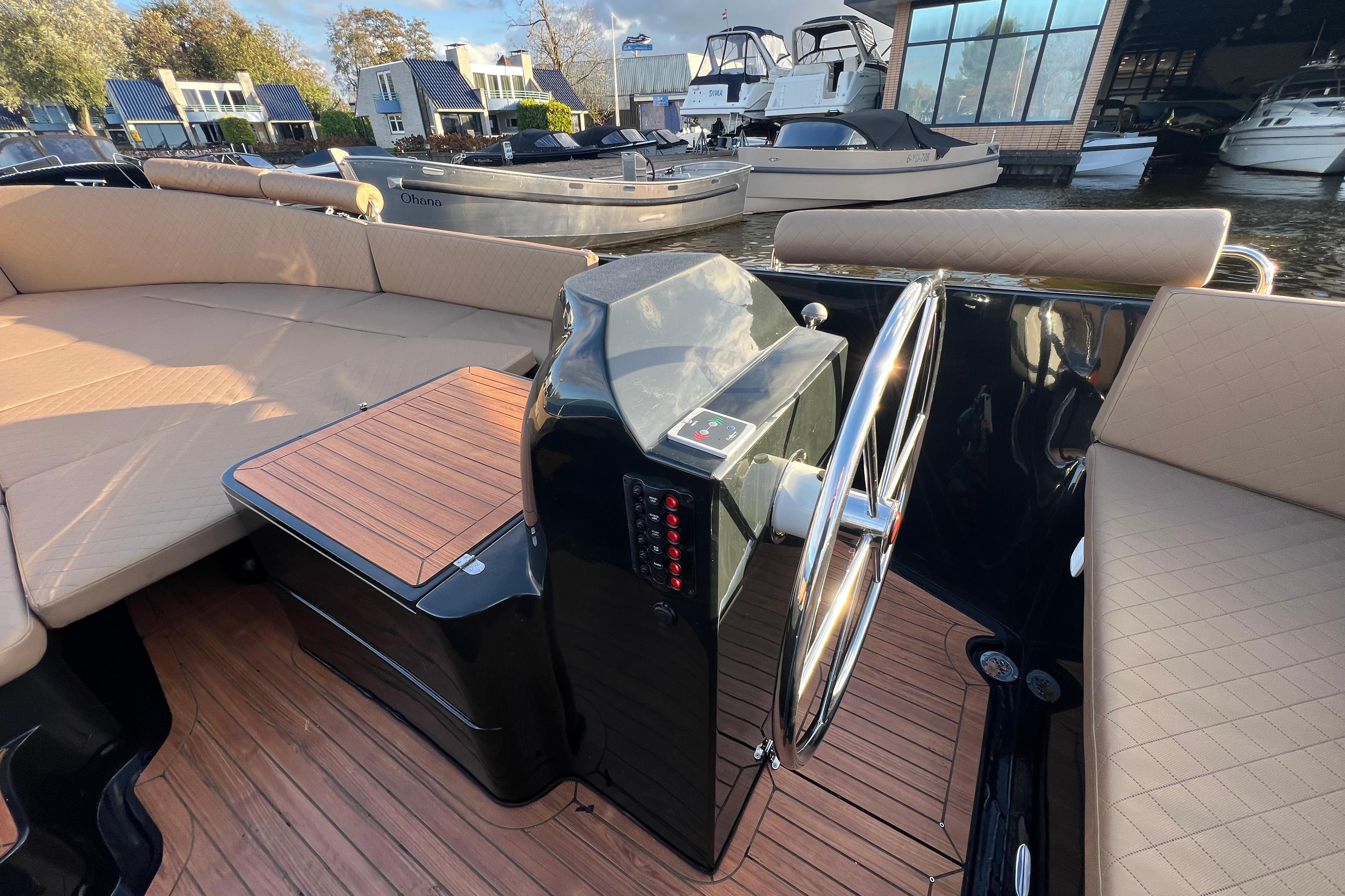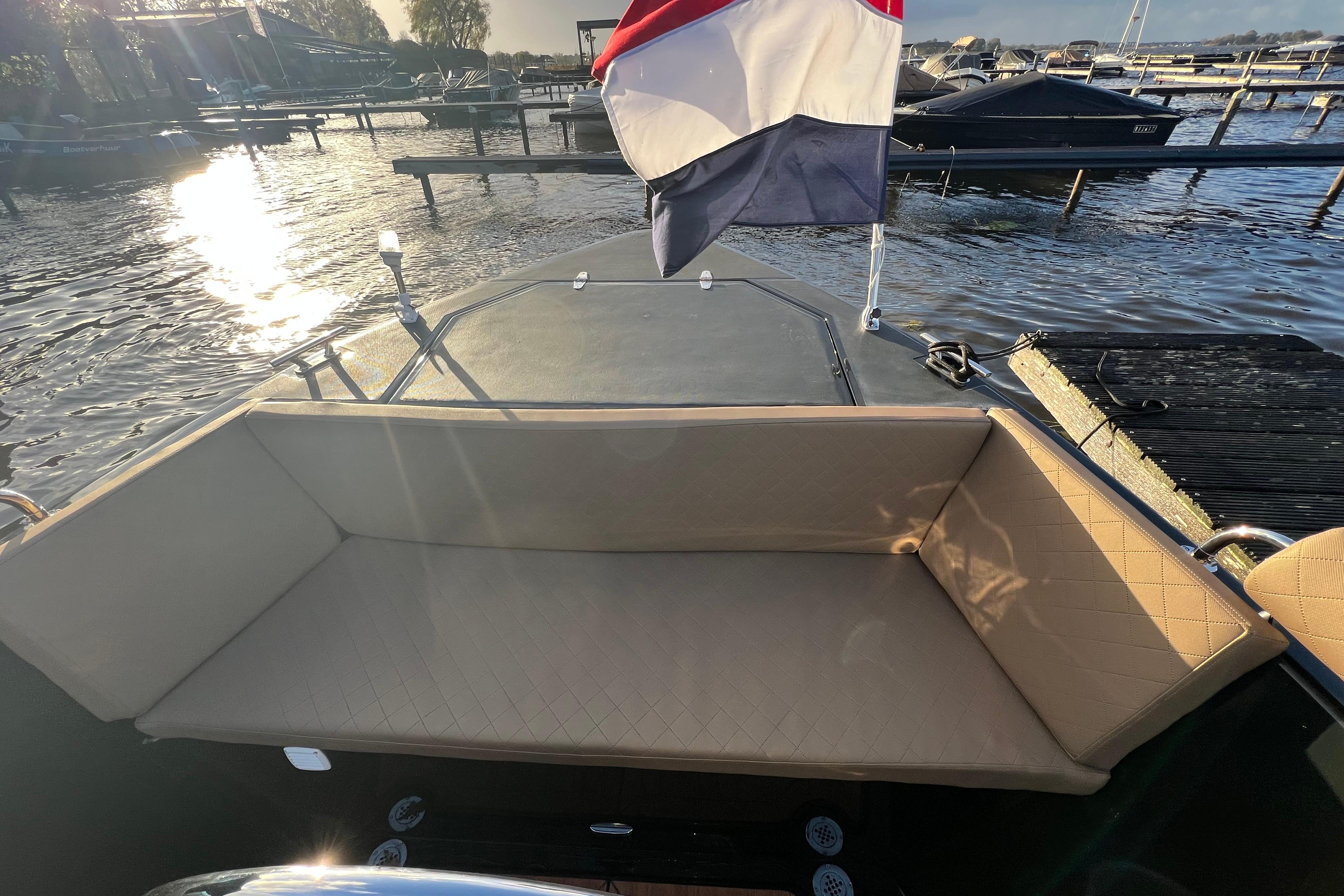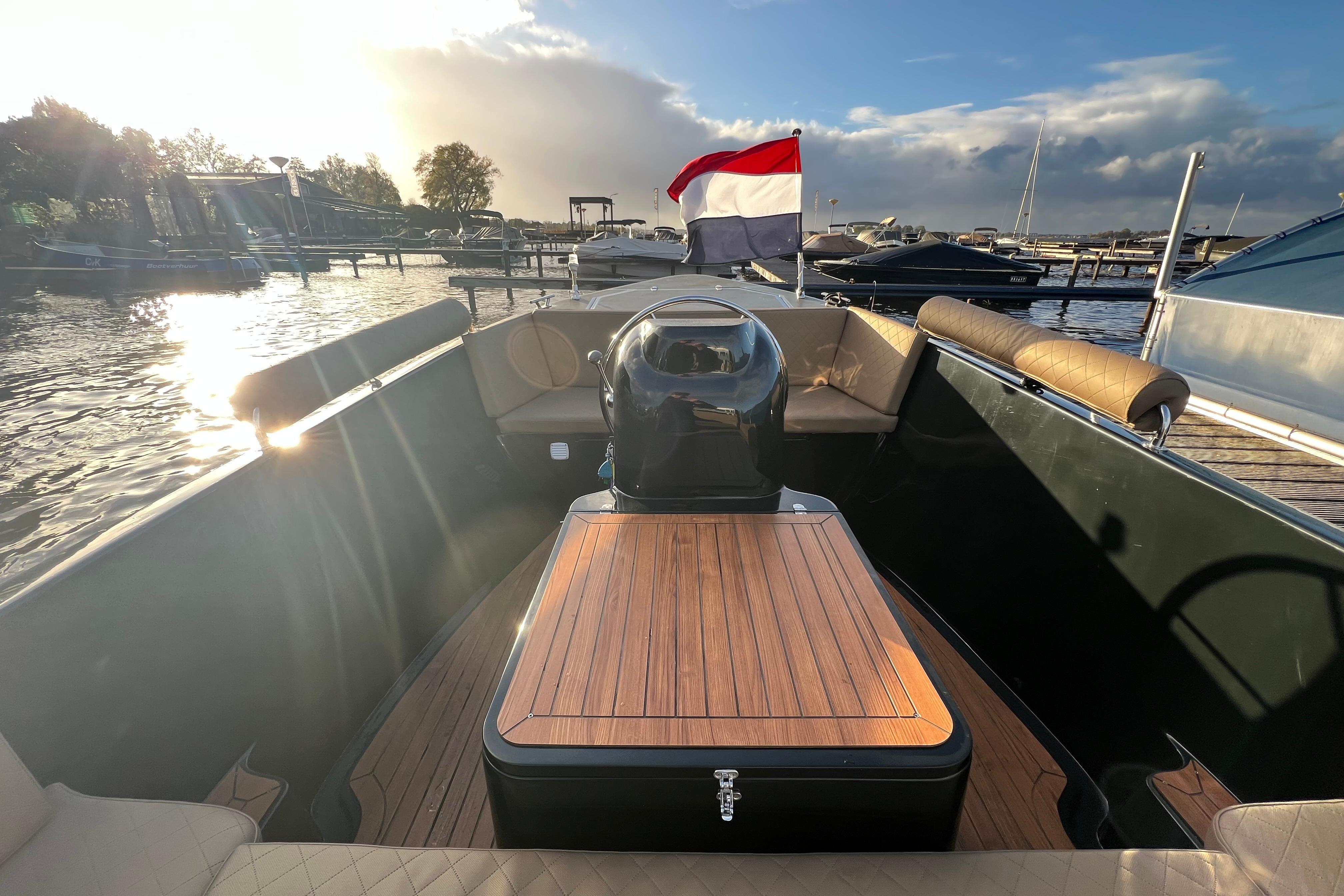 De Stout 750 is voorzien van een hoogglans zwarte romp, diamante gewatteerde kussenset, rolkussens, zonnedek, boegschroef, anti fouling, kuiptafel, complete buiskap welke ook dient als biminitop, droogtoilet, extra accu, kuip verlichting LED, USB aanlsuitingen, inbouw gas hendel, FIN Teak vloer, zwemplateau, zwemtrap, waterski ogen, toplicht, navigatieverlichting, zwemvesten, anker, fenders en lijnen.
